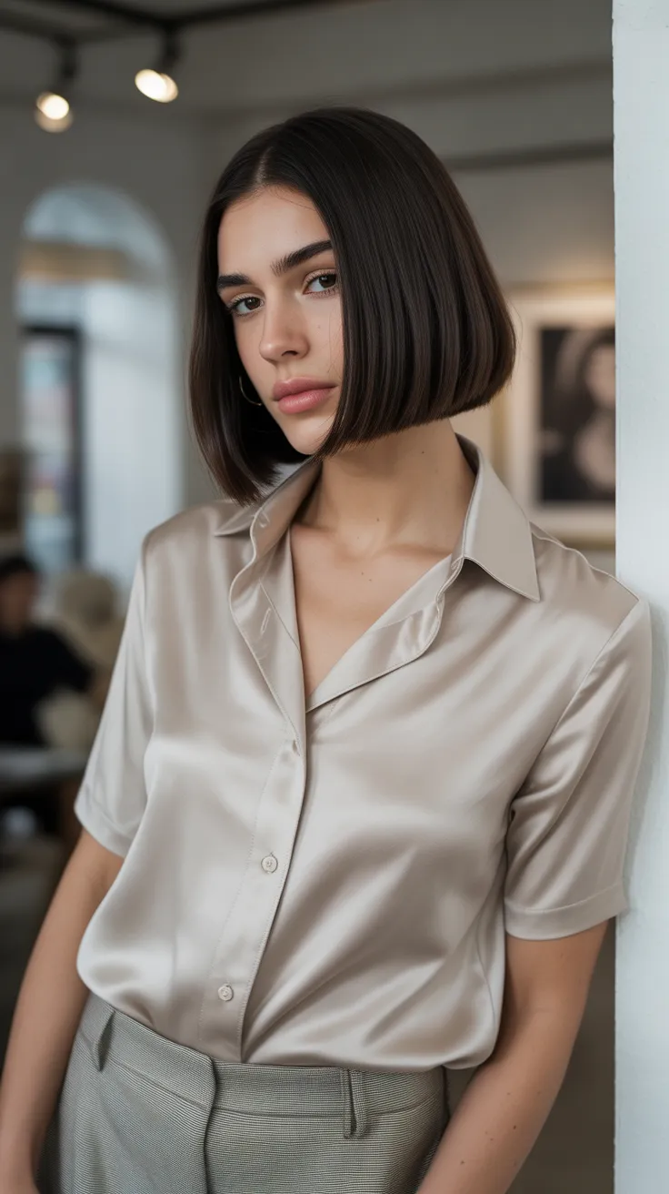 With its straight lines and smooth texture, this short haircut is low-maintenance yet high-impact. You can easily style it with a bit of serum or mousse to keep those flyaways at bay. Plus, it frames the face beautifully, highlighting your features.