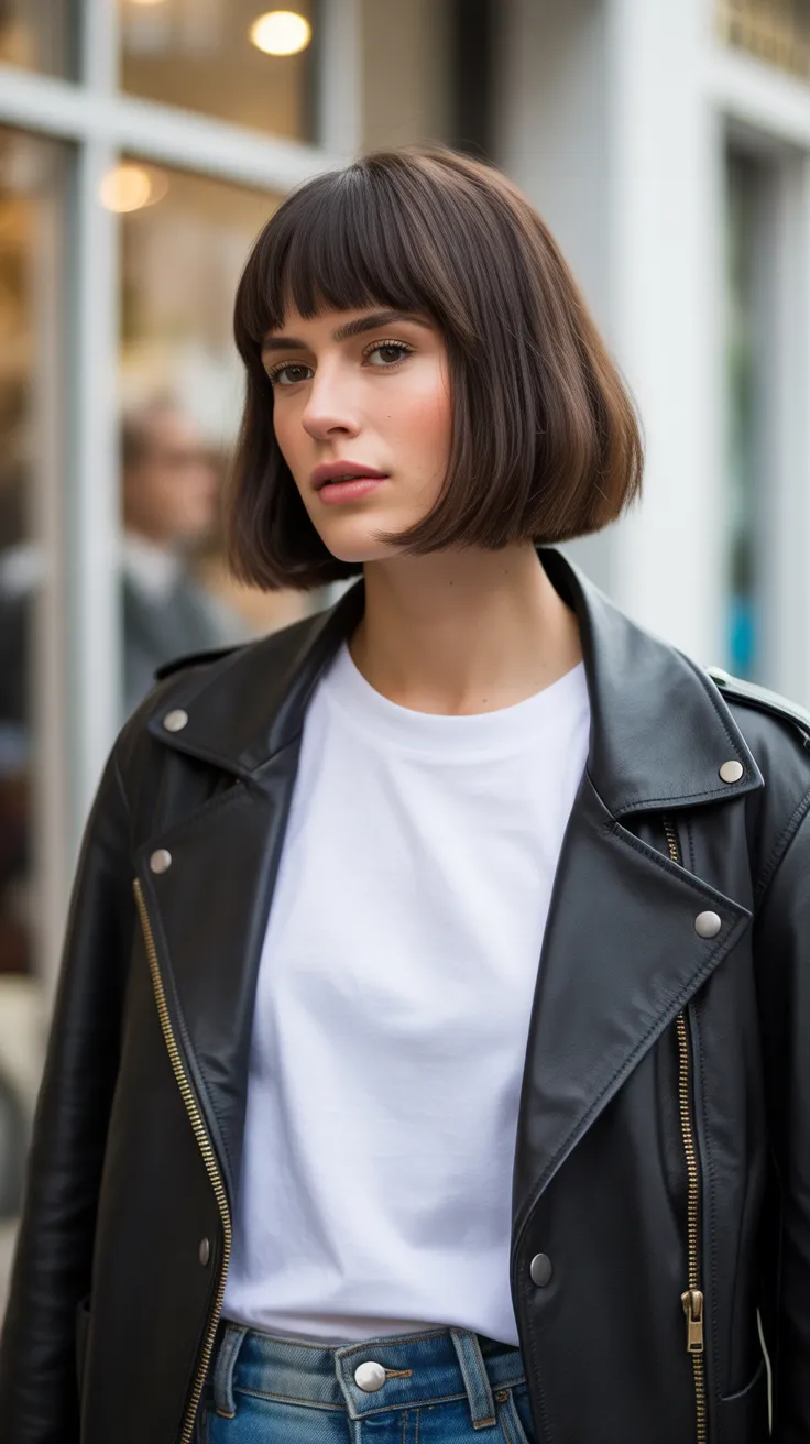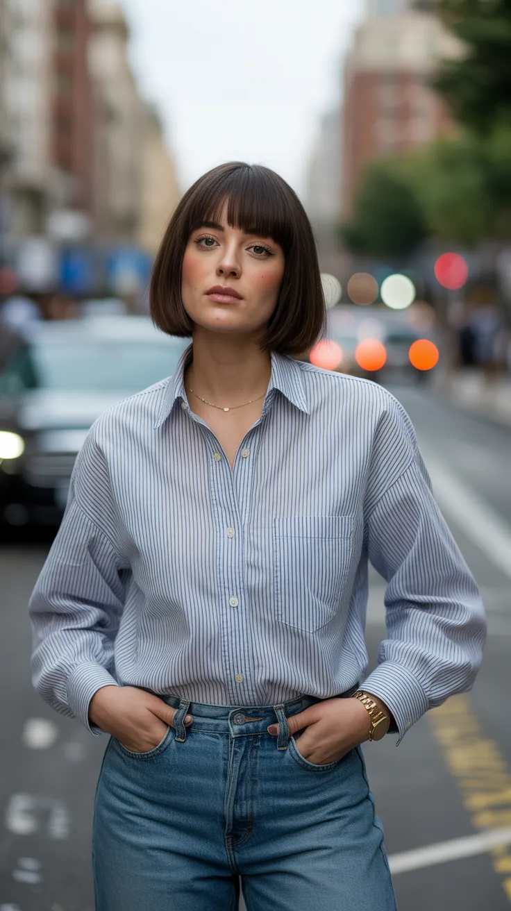 This particular bob features soft bangs that add a touch of playfulness. The straight short hair creates a clean silhouette, making it a go-to choice for those seeking short haircut inspo. Pairing this look with a simple striped tee, as shown, enhances its casual yet sophisticated vibe.