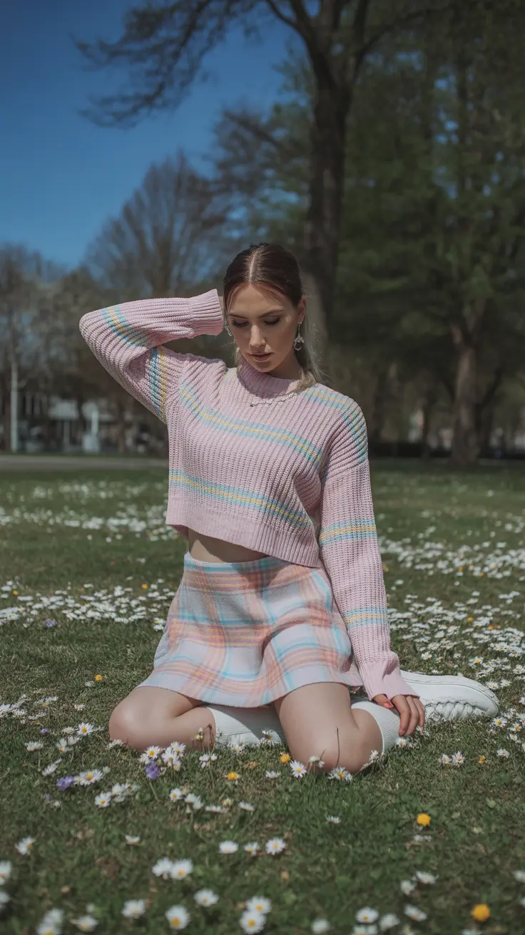 The choice of colors is key here. Soft pastels like light pinks and blues evoke a sense of calm and sweetness. This combination works well for a casual day out or even a cozy gathering with friends. The outfit is completed with trendy white sneakers, making it both stylish and comfortable.