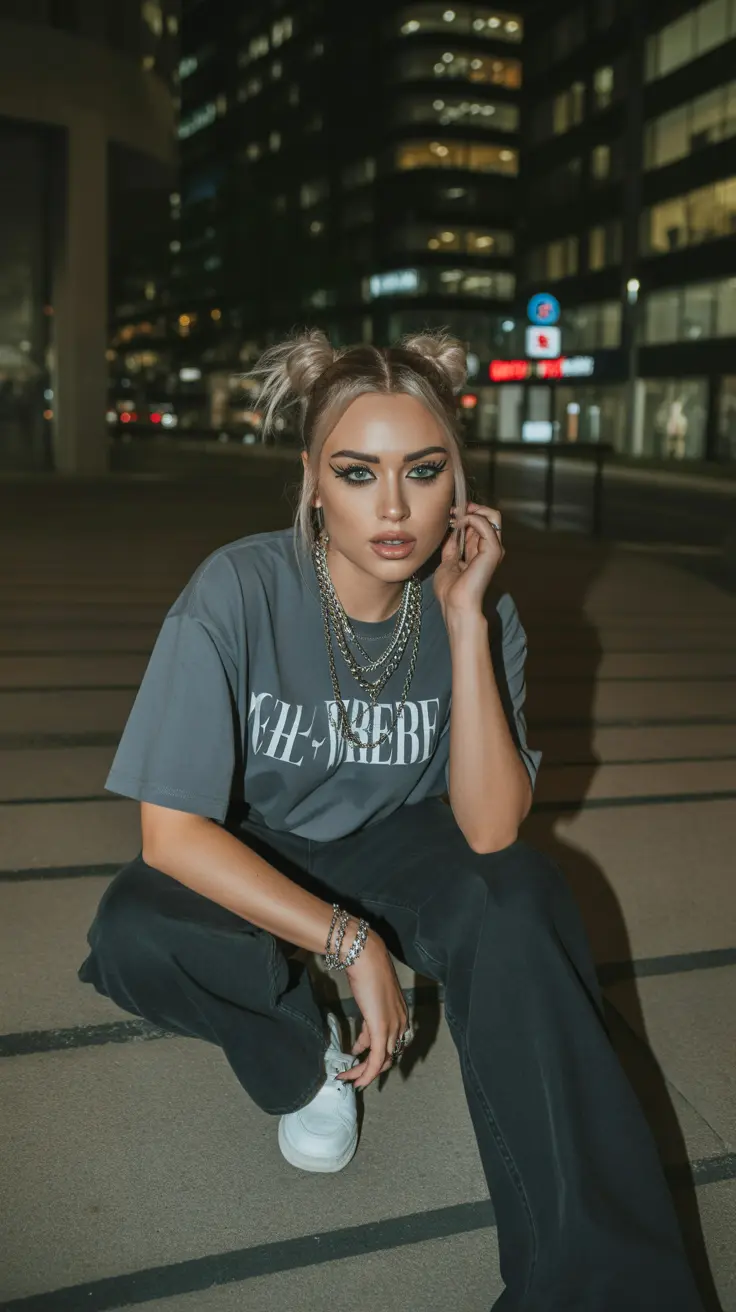 Chains add a bold touch to the outfit. Layering multiple chains creates a striking contrast against the simplicity of the tee. This combination captures the essence of grunge outfit ideas, blending punk influences with modern trends.