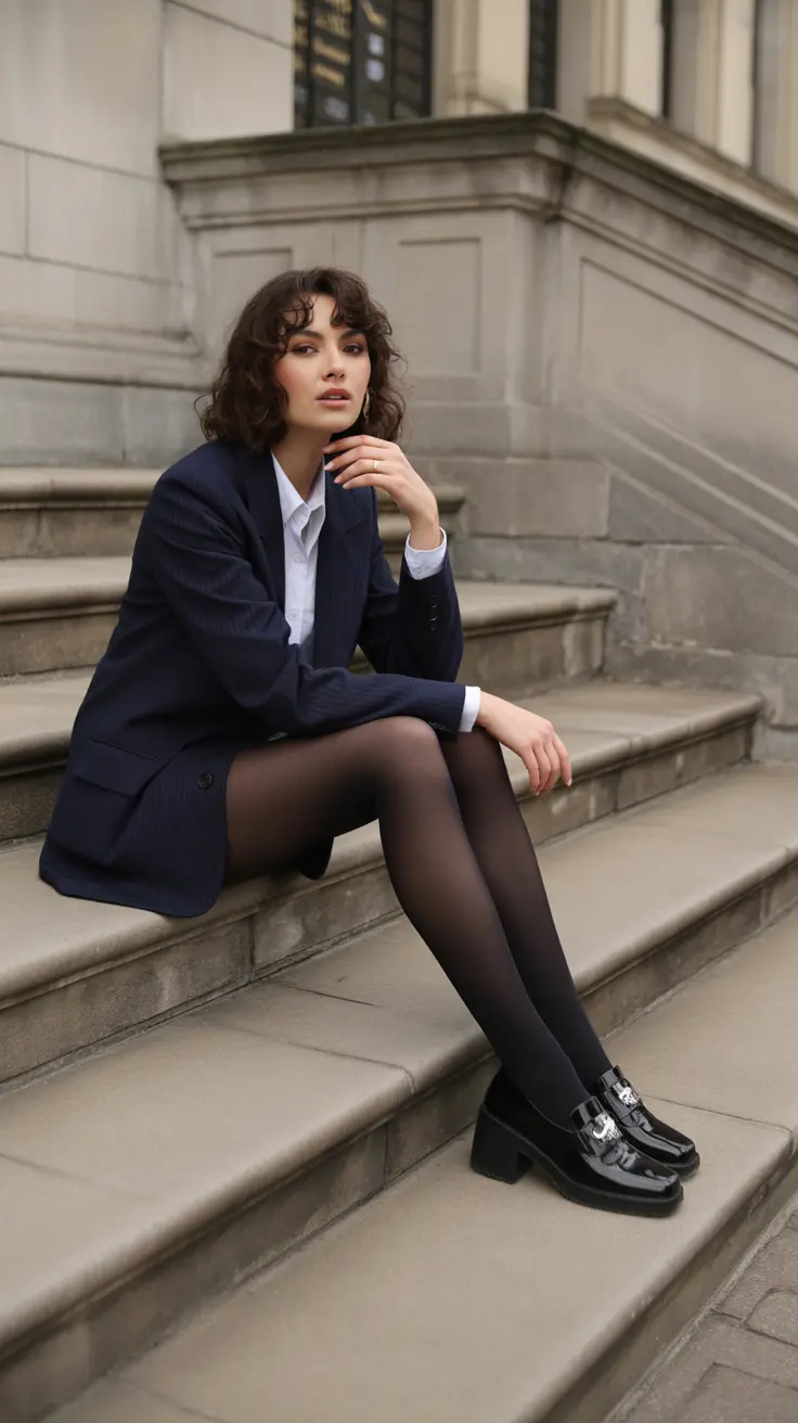 In the image, you can see a stylish individual confidently wearing a tailored black blazer over a light-colored blouse. The sleek lines of the blazer enhance the overall look, while the tights add a touch of modern flair. This combo can easily transition from a day at the office to a casual evening out.