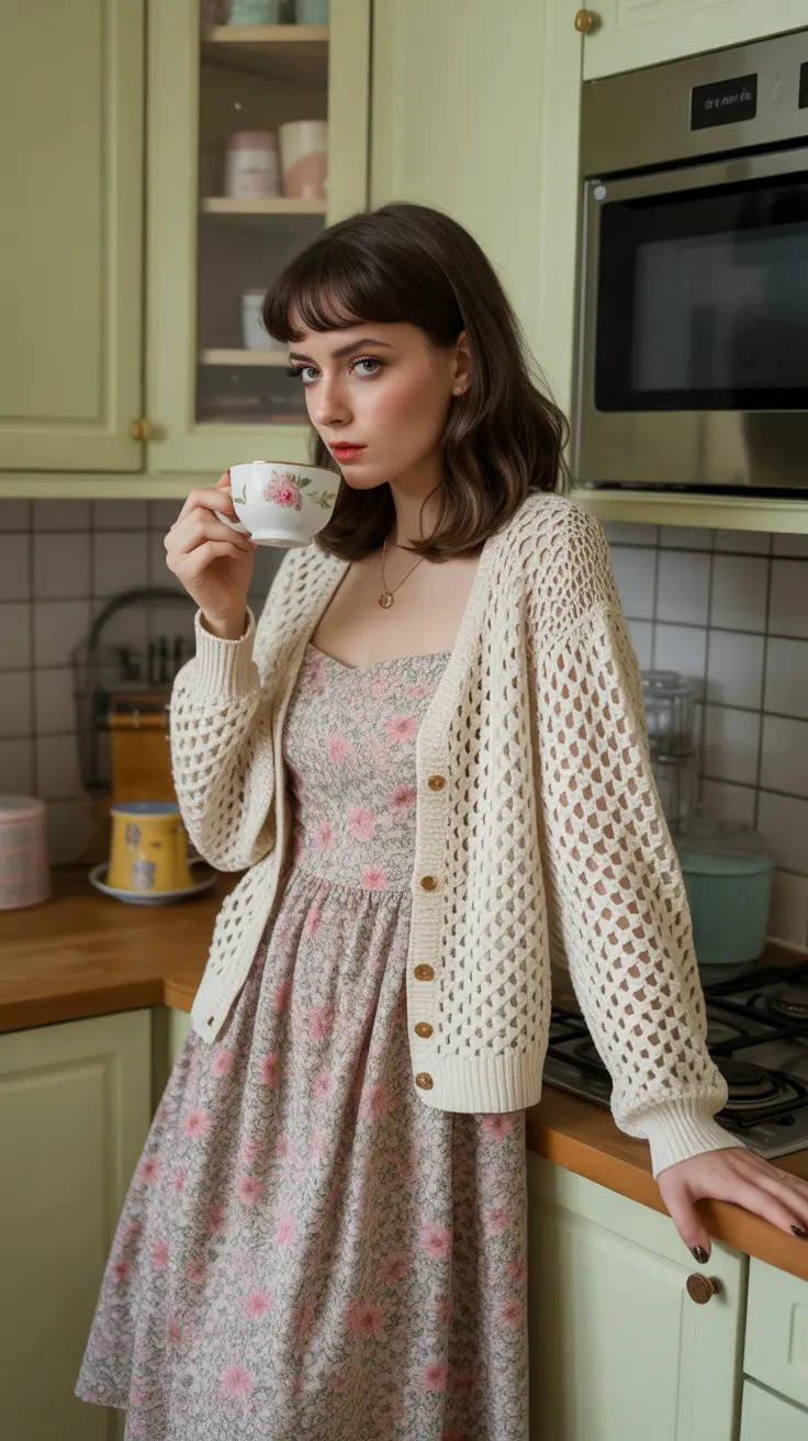 In the image, we see a lovely outfit that embodies this aesthetic. The floral dress features bright pink roses, which add a cheerful pop of color. Layering it with a crochet cardigan enhances the cozy feel, making it ideal for any casual outing. This combination is a great example of how to mix textures and patterns while staying true to core style fashion.