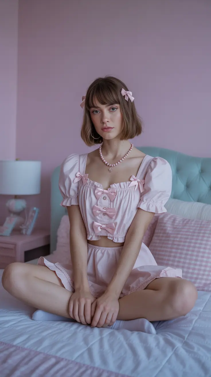 The girlcore aesthetic shines brightly with its playful use of bows and frills. This style embraces femininity and charm, making it perfect for those who love to express their softer side. The outfit in the image captures this vibe beautifully, featuring a lovely pink dress adorned with oversized bows. These details add a touch of whimsy and fun, making it a standout choice for any occasion.