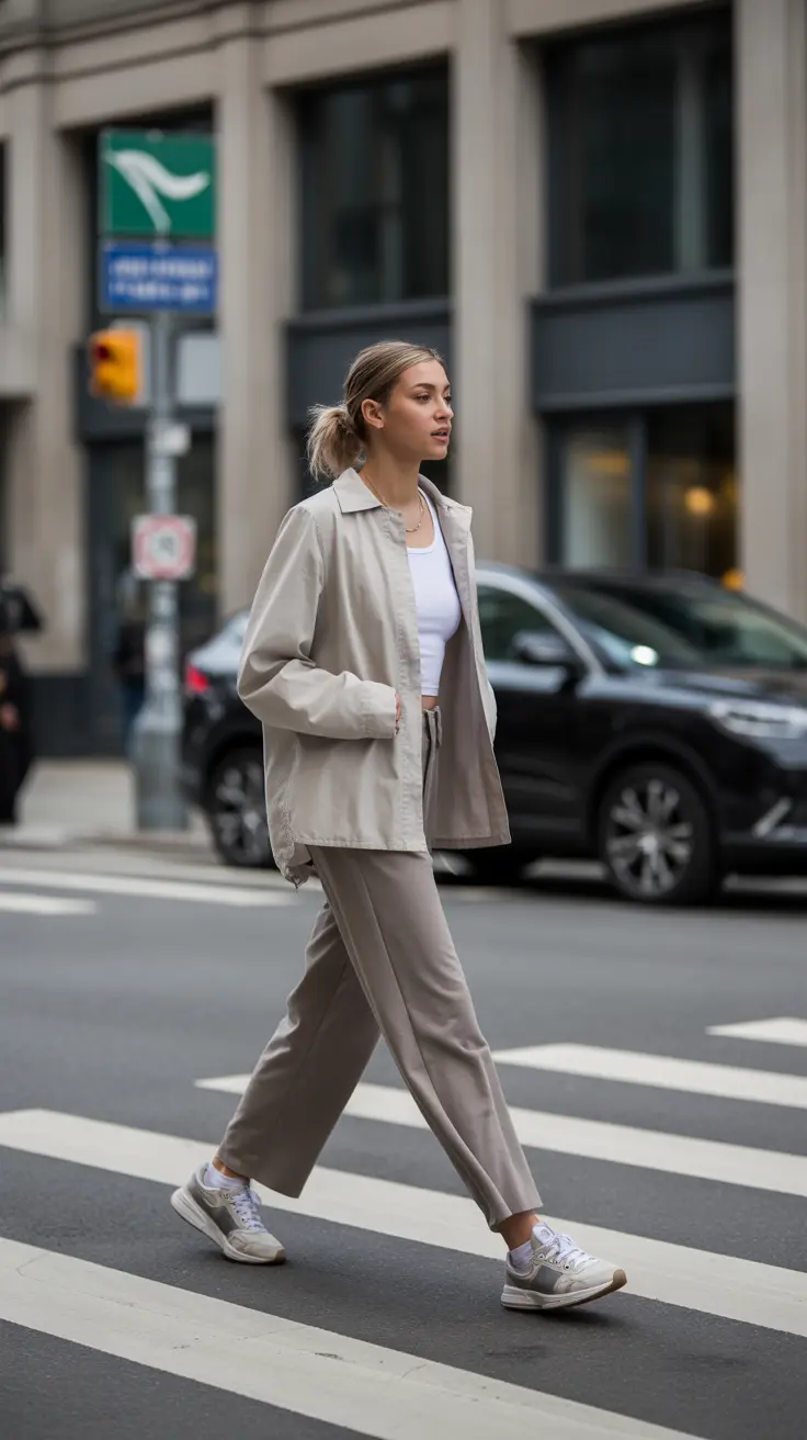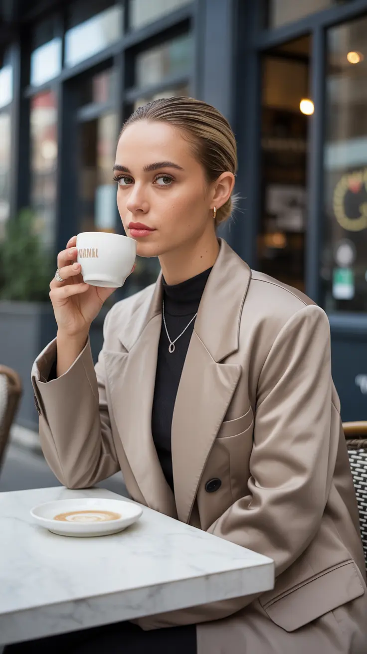 The clean girl aesthetic is all about simplicity and elegance. This style shines through in neutral tones and sleek hairstyles. In the image, we see a confident woman rocking a chic outfit that perfectly embodies this vibe.