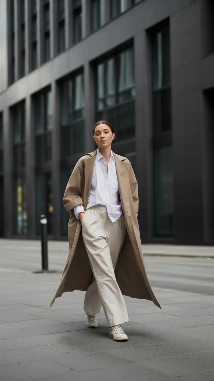 The oversized coat adds a touch of comfort while maintaining a polished appearance. The neutral color palette keeps the outfit fresh and versatile, making it easy to mix and match with other pieces. This style resonates with the clean girl aesthetic, focusing on a refined yet relaxed look.