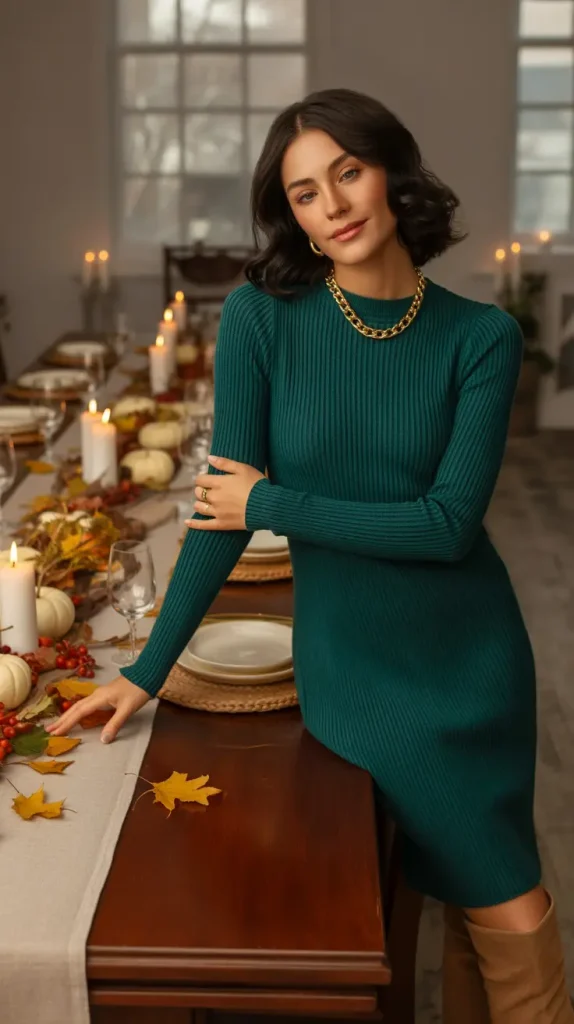 Green instantly feels rich and seasonal, which is why an emerald sweater dress is a no-brainer. Pair it with suede boots and chunky gold jewelry, and suddenly you’re giving “effortless chic” at the dinner table. It’s polished enough for family photos but comfortable enough for a second plate of stuffing. This fall dinner outfit is proof that sweater dresses are forever winners. Ever notice how one statement necklace can turn a simple piece into a showstopper? Yeah, that’s the magic here.