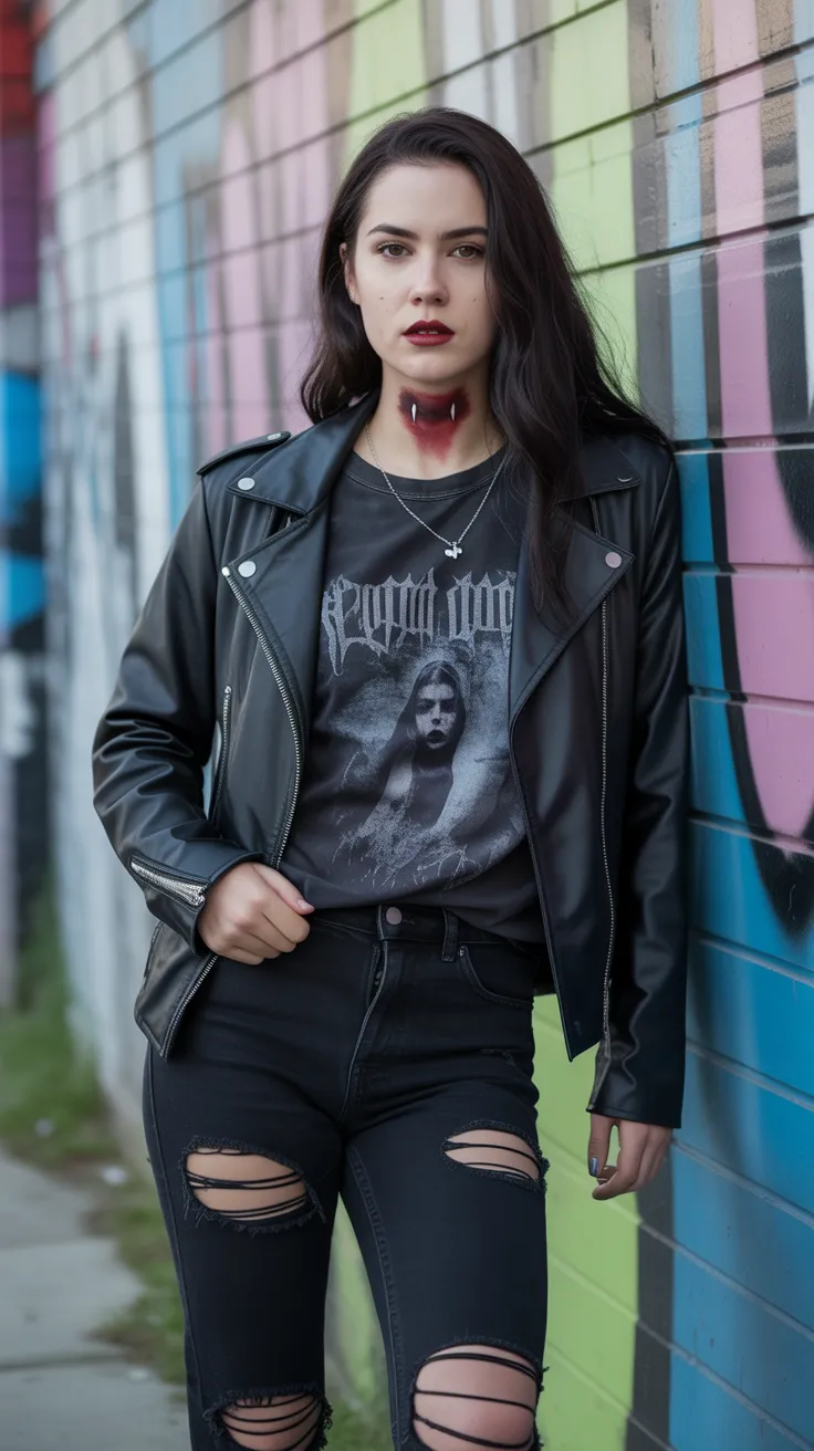 For a chic twist on the classic vampire Halloween costume, try a casual goth look with subtle vampire bite details. A sleek black leather jacket paired with a simple dress gives off that vampire lady aesthetic without being over the top. This outfit is perfect for those who want to channel their inner Dracula while keeping it stylish and comfortable!