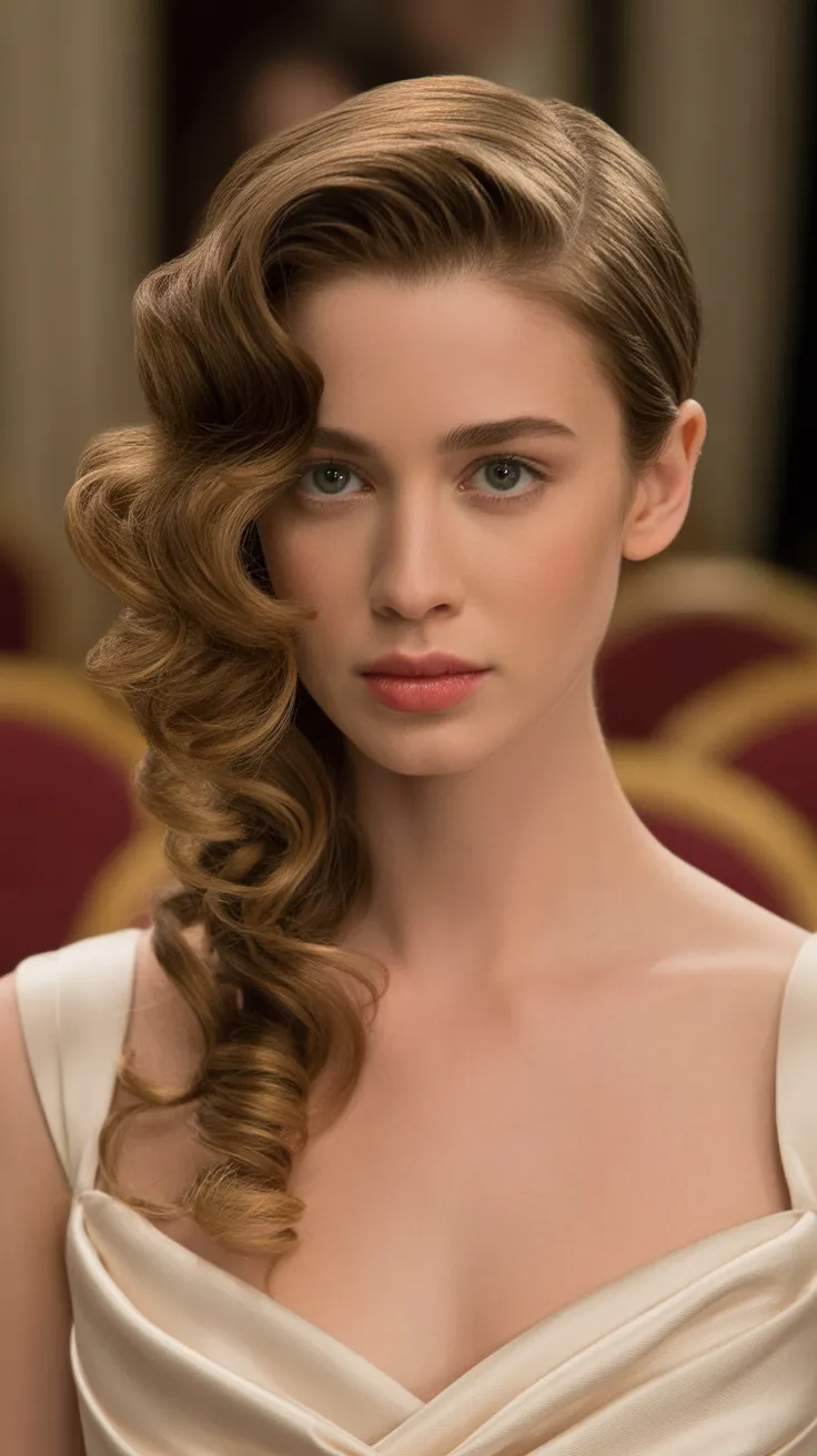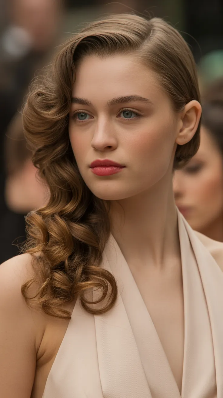 Side-swept retro curls are a stunning way to channel old Hollywood glamour. This hairstyle features voluminous curls that cascade elegantly to one side, creating a soft and romantic look. The curls are bouncy and full, adding a touch of drama that’s perfect for any special occasion.