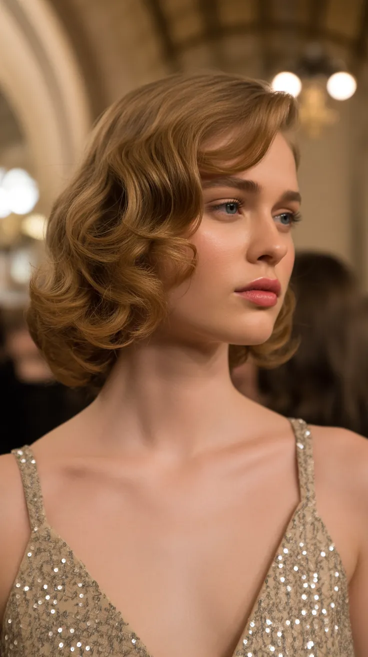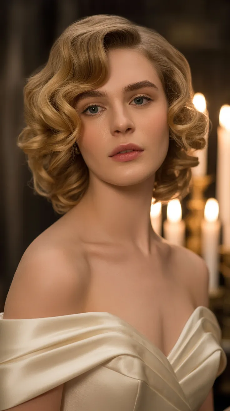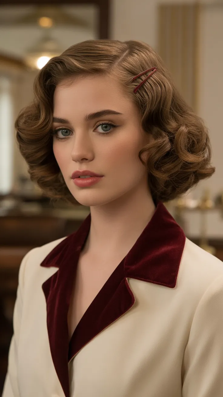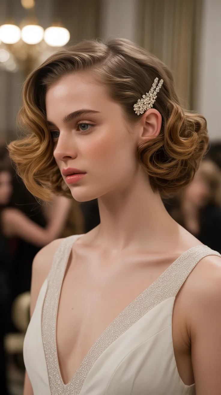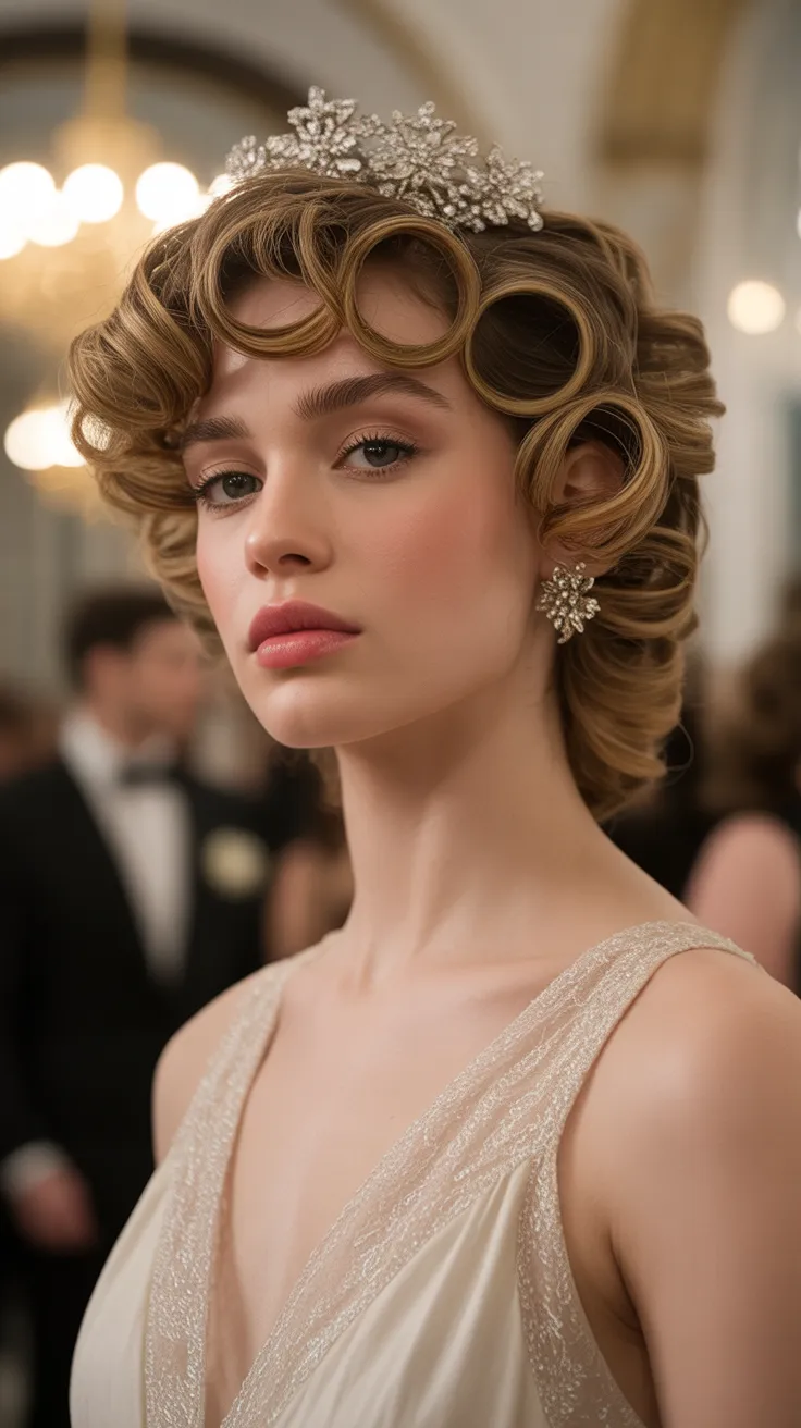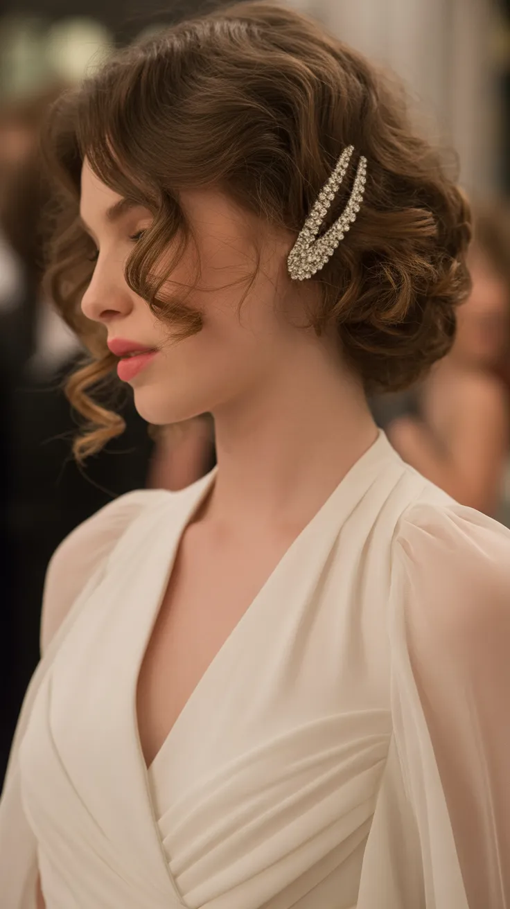 The curls are styled to frame the face beautifully, enhancing the features and giving a polished appearance. A decorative hairpiece, like the sparkling accessory seen here, adds a delightful touch of sophistication. This combination of vintage curls and a chic accessory is a nod to the timeless styles of classic cinema.