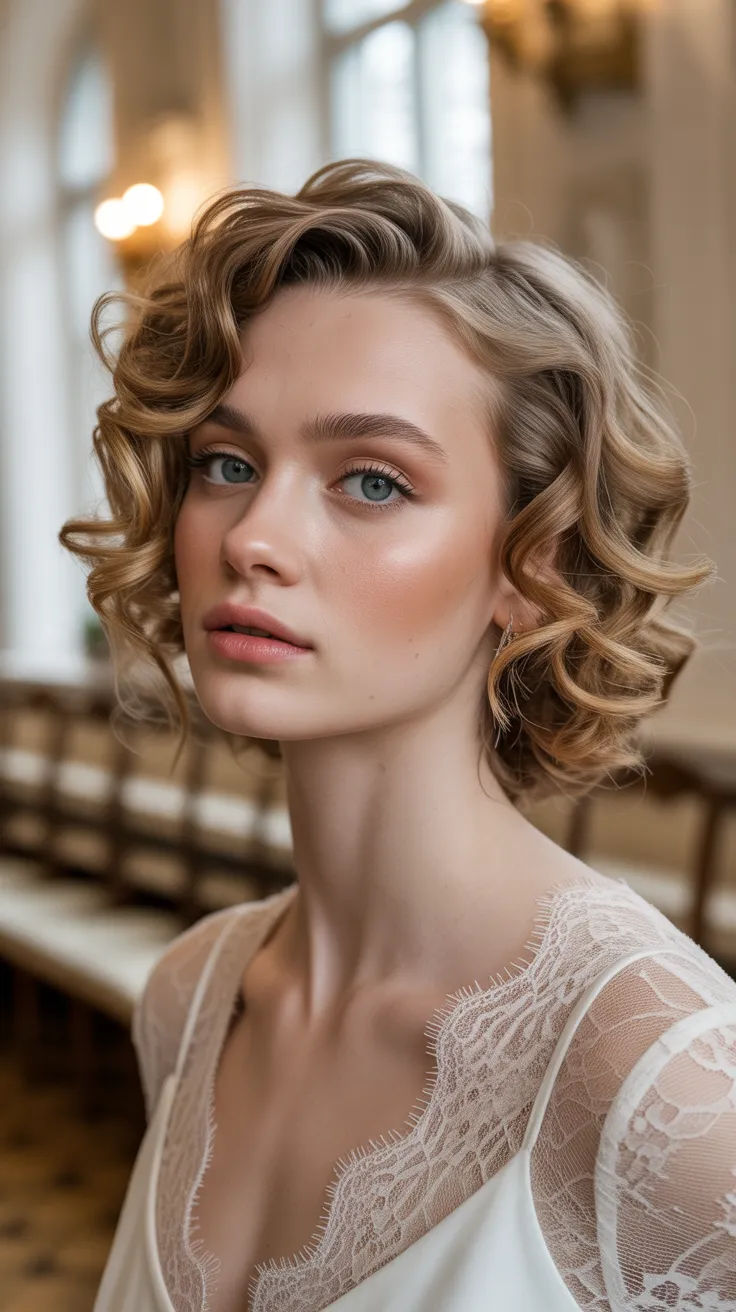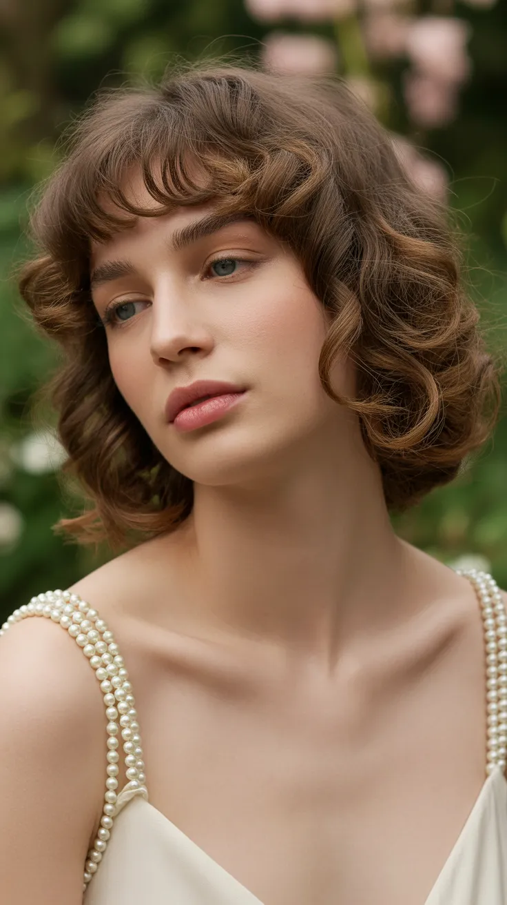 The 1920s brought a fresh wave of style, and tight curls were at the forefront. This look captures the essence of old Hollywood curls, showcasing a playful yet sophisticated vibe. The model’s hair is styled in bouncy, vintage curls that frame her face beautifully.