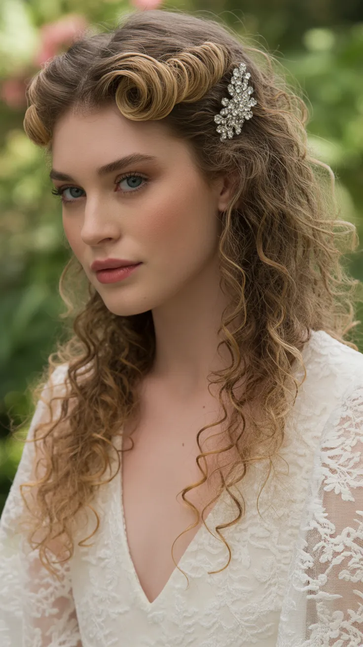 In the image, we see a stunning example of vintage curls styled in a half-up fashion. The soft, cascading curls frame the face beautifully, while the pinned-up section adds a touch of sophistication. A sparkling hair accessory enhances the vintage vibe, making it feel even more glamorous.