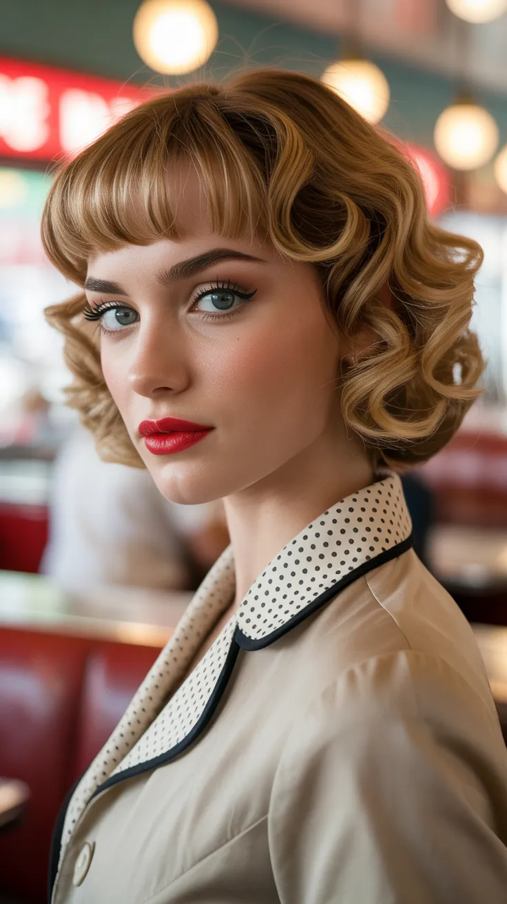 When styled correctly, these vintage curls can give you that timeless appeal reminiscent of iconic film stars. The combination of short hair and rolled bangs creates a fresh yet nostalgic look that stands out. Whether you’re attending a themed party or just want to feel fabulous, this hairstyle is sure to impress.