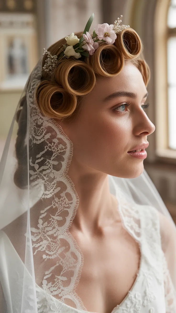 In this stunning style, the curls are perfectly defined, adding volume and movement. Floral pins, like delicate roses and daisies, enhance the vintage vibe, giving a fresh and whimsical touch. These accessories not only complement the hairstyle but also add a personal flair, making the bride feel unique.