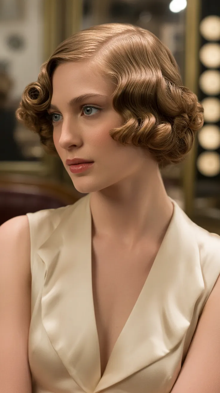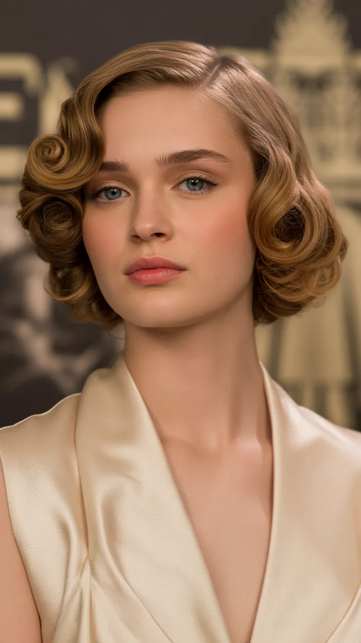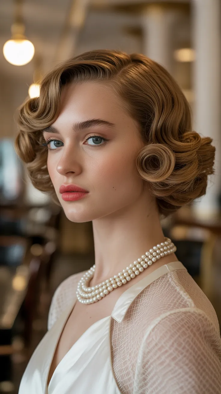 The 1930s were a golden era for vintage curls, showcasing styles that radiated glamour and sophistication. This image perfectly captures the essence of structured curls that defined the decade. The soft, glossy waves frame the face beautifully, enhancing the model’s features.