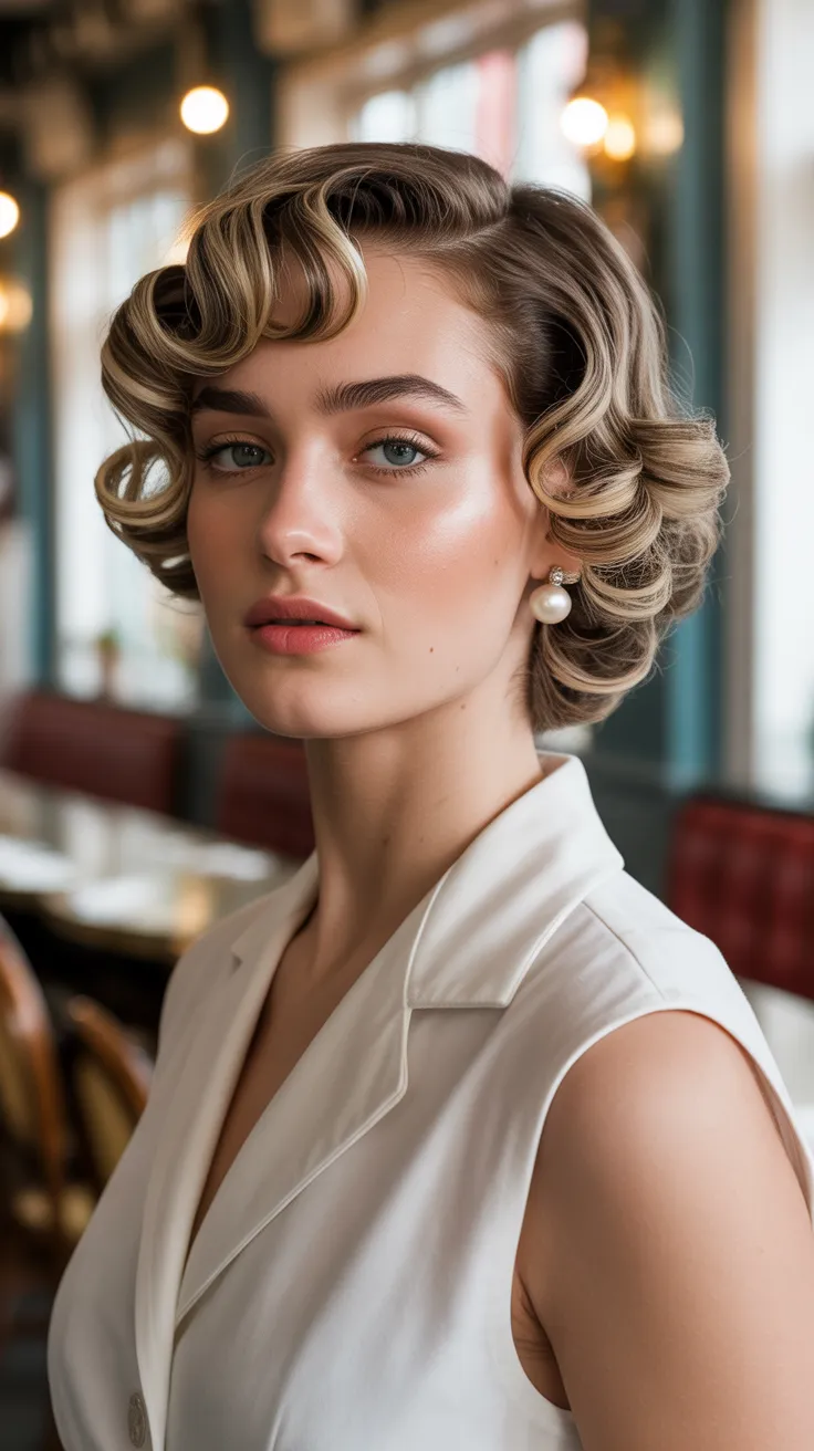 Short vintage curls with rolled bangs are a stunning way to channel old Hollywood glam. This hairstyle captures the essence of retro curls, bringing a playful yet sophisticated vibe. The rolled bangs frame the face beautifully, adding a touch of charm and elegance.