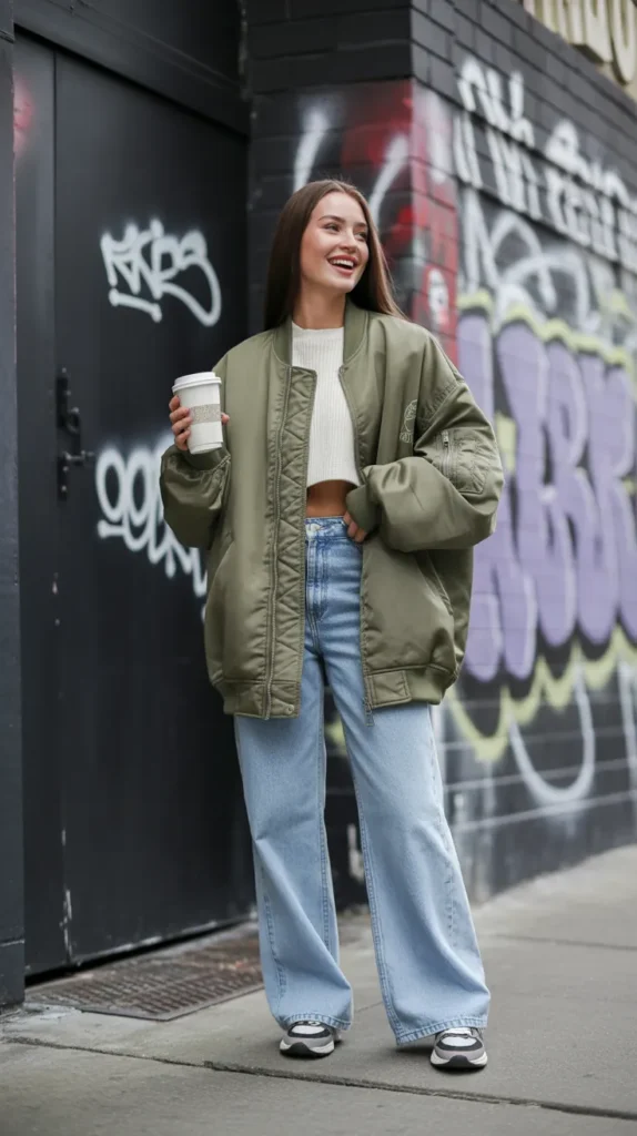 Start your day in an oversized bomber jacket layered over a ribbed crop sweater, wide-leg jeans, and sneakers for a streetwear-inspired vibe. It’s one of those cool girl winter outfits that looks effortlessly thrown together but totally intentional cozy, confident, and casually perfect for city strolls.