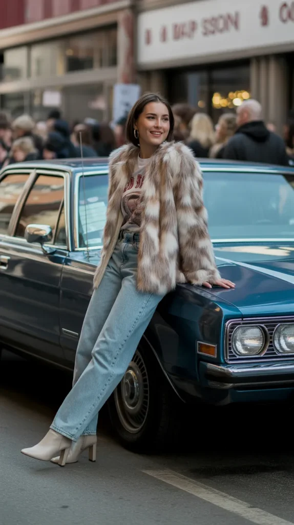 A faux fur jacket, graphic tee, straight jeans, and heeled booties strike the perfect flirty-casual balance. This cold weather outfit gives playful confidence while keeping you perfectly snug a little sass never hurt anyone 😉.