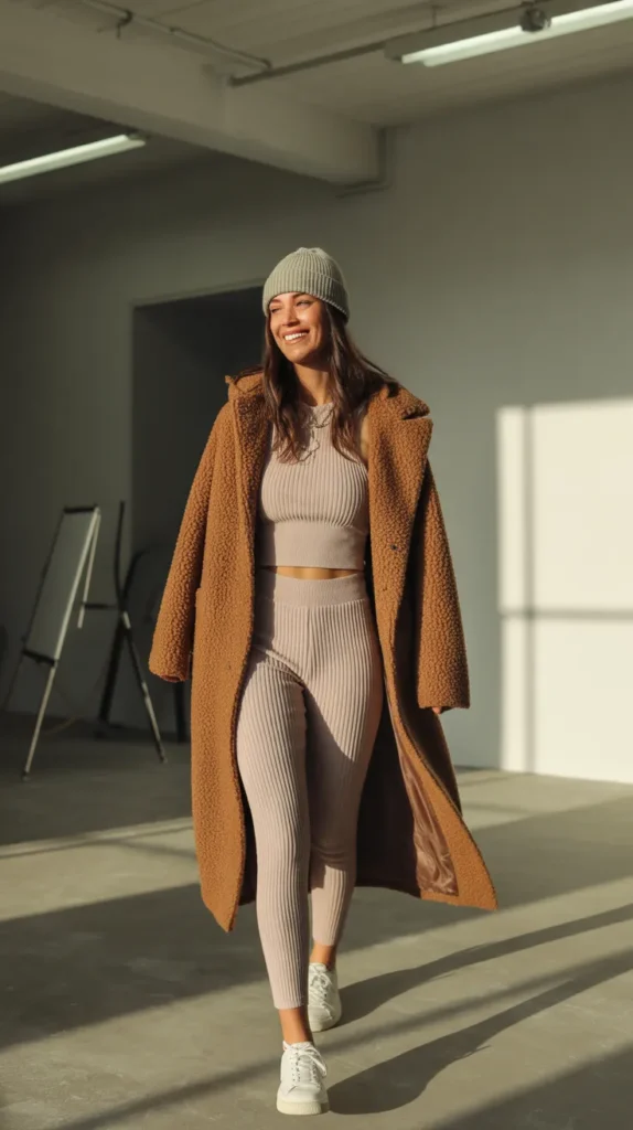 Slip into a teddy coat over a ribbed set, paired with sneakers and a beanie. It’s the ultimate warm winter outfit that makes lounging look like a fashion statement cozy but still totally Instagram-worthy.