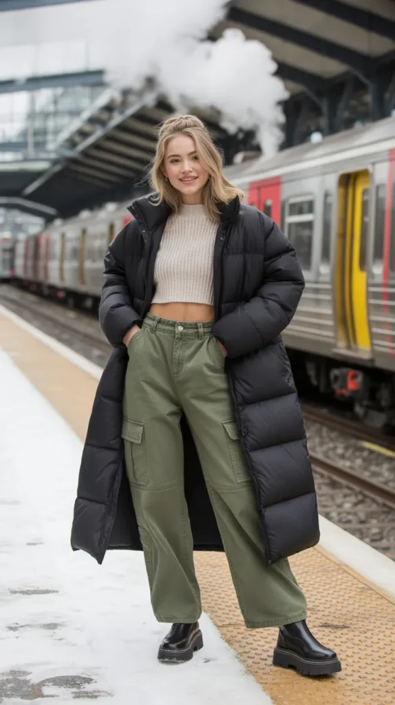 A longline puffer with a cropped sweater, cargo pants, and chunky boots brings edgy comfort to your cold weather outfits. It’s functional yet fashion-forward ideal for travel days or casual hangs that still deserve a stylish touch.