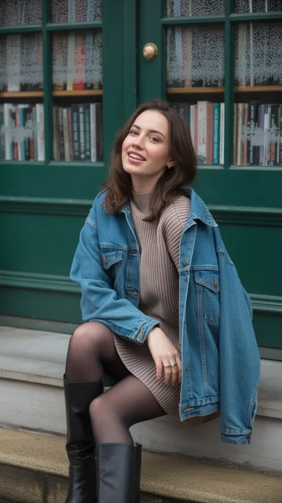 Pair a knit dress with an oversized denim jacket, tights, and boots for a cute and casual winter combo. This outfit nails the balance between comfort and structure, making it perfect for both errands and evening cocoa stops.