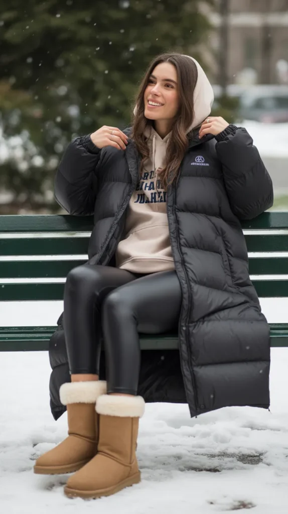 A puffer coat, hoodie, and leggings with Ugg boots is your no-brainer cold weather outfit for ultimate comfort. It’s giving “coffee run chic” snuggly but cute enough to bump into your ex and still look unbothered 😌.