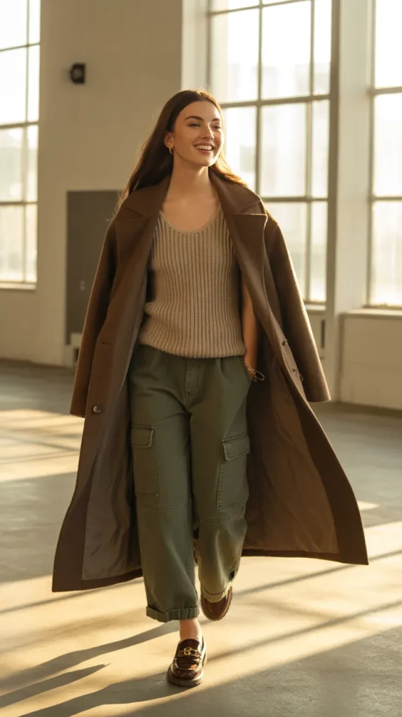 Go for a long wool coat with a knit tank, cargo pants, and loafers to master that “I didn’t try, but I look amazing” vibe. This warm winter outfit mixes soft textures and structured silhouettes perfect for cool girls who love minimal elegance.