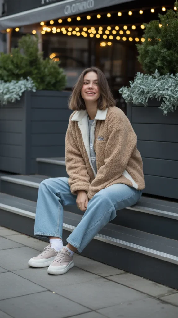 A sherpa jacket, oversized tee, straight jeans, and platform sneakers create an easy casual outfit with a streetwear twist. It’s comfy, cool, and ideal for those off-duty winter days when you just want to feel cozy but look effortlessly on-trend.