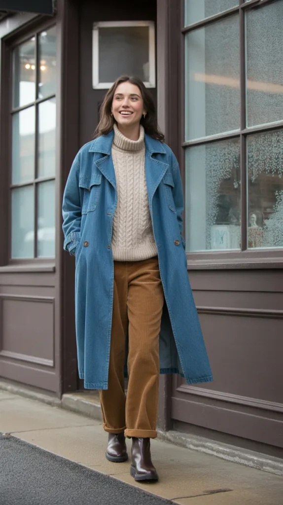Layer a denim trench over a cable-knit sweater and corduroy pants, then finish with boots for a fresh spin on cold weather outfits. The mix of materials denim, knit, and corduroy gives instant retro warmth and a dose of laid-back sophistication.