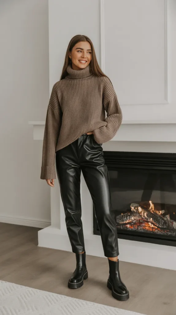 Pair a chunky turtleneck with faux leather pants and Chelsea boots for a sleek yet cozy outfit. It’s modern, warm, and ideal for chilly city days when you want comfort with a little bite of edge.