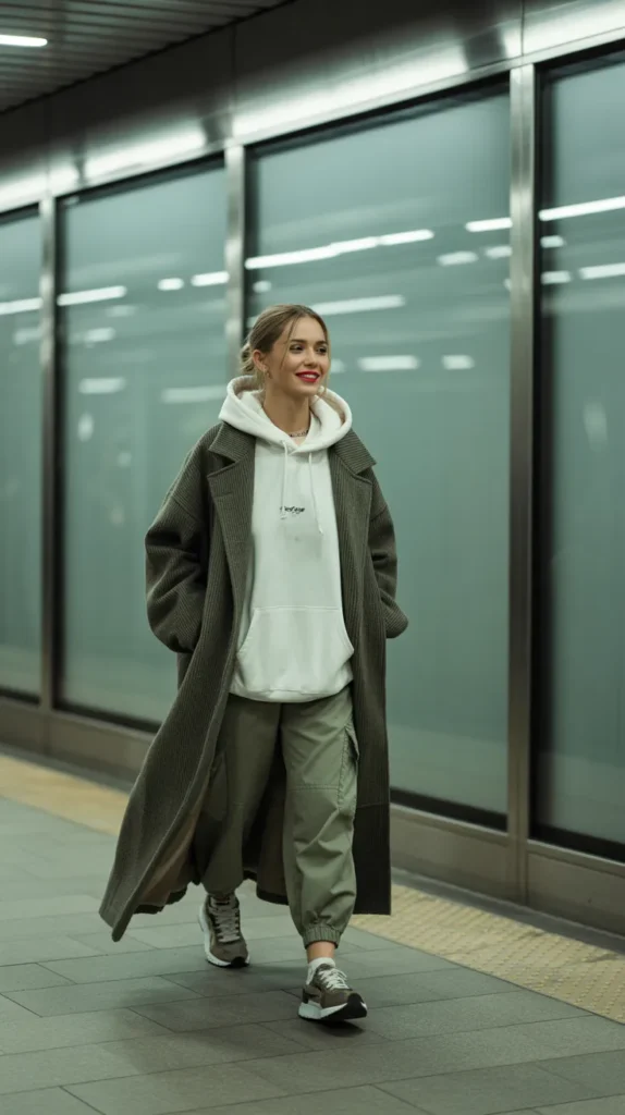 Throw an oversized hoodie under a long wool coat, add cargo joggers, and finish with sneakers for that cool-girl-on-the-go aesthetic. This warm casual outfit nails the laid-back luxury look comfy, practical, and undeniably stylish.