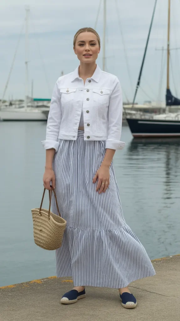 For coastal chic, style a crisp white denim jacket with a navy striped maxi skirt and espadrilles. This is a great option for vacations or summer evenings by the water.