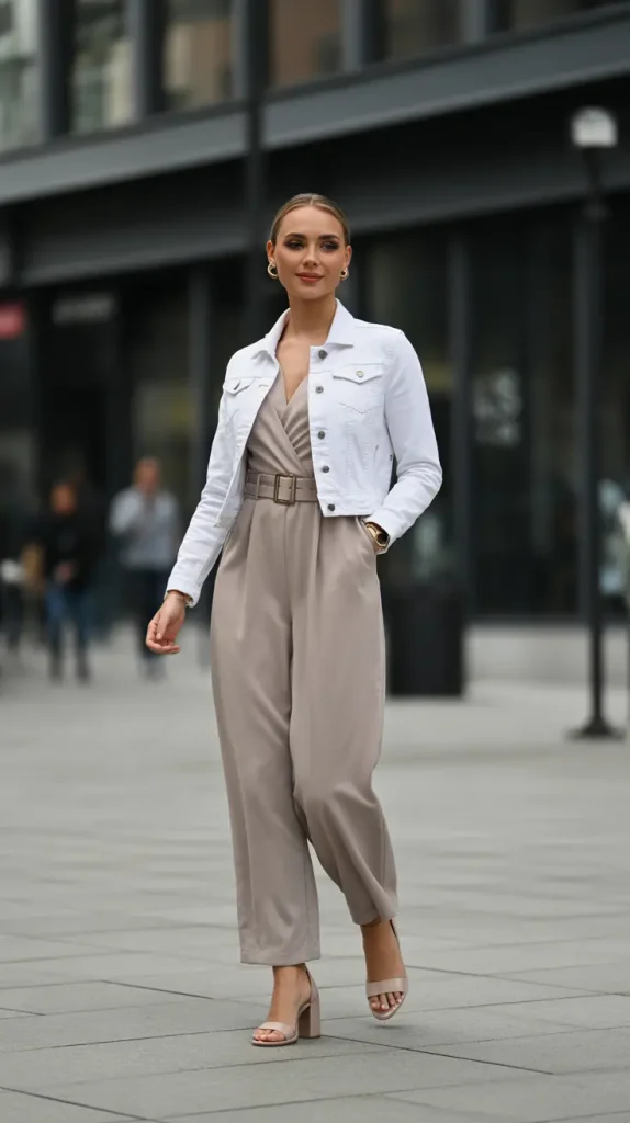 Layering a fitted white denim jacket over a belted neutral jumpsuit instantly refreshes the one-piece look. Block heels complete the ensemble, making it perfect for daytime events or dinners.