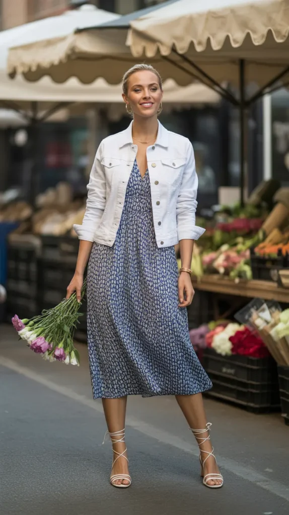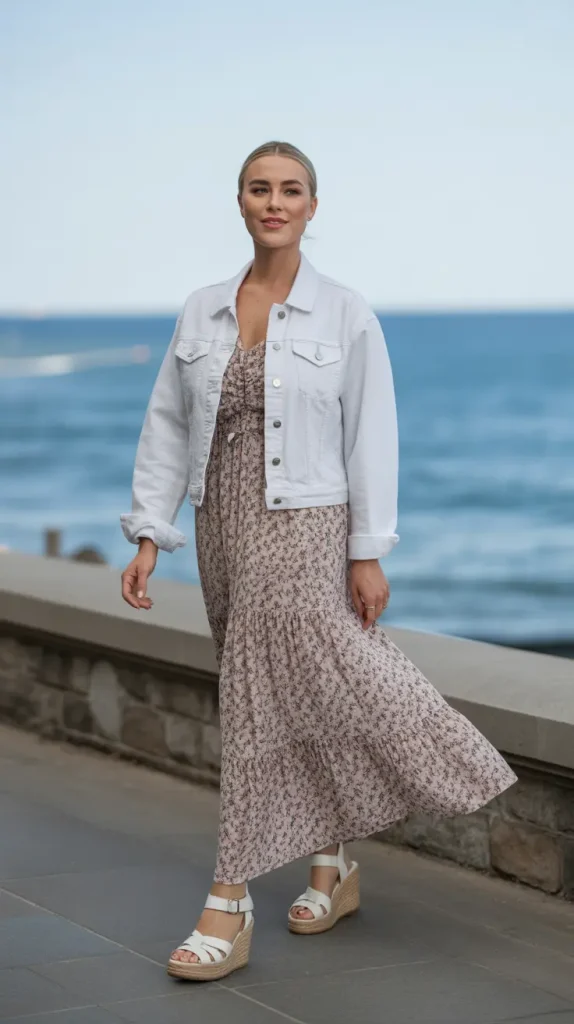 Layering a white denim jacket over a floral maxi dress gives you the perfect mix of casual and feminine. This look works wonderfully for outdoor markets, beach dinners, or weekend getaways.