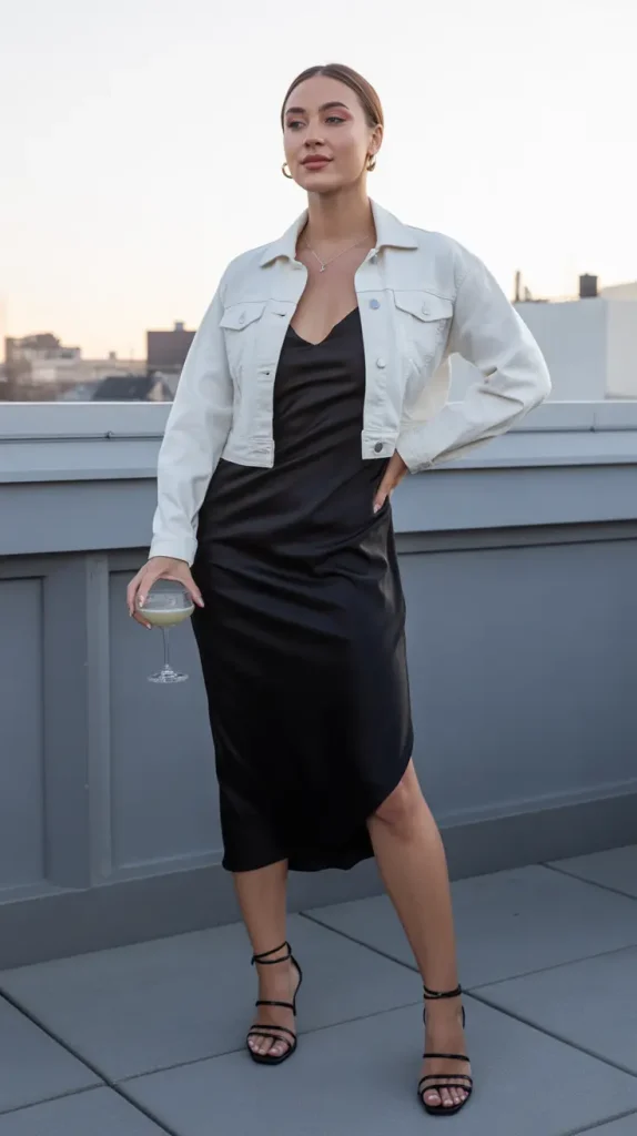 For a chic evening layer, pair a white denim jacket with a sleek black slip dress and strappy heels. This contrast makes for an easy denim jacket night outfit that feels sophisticated.