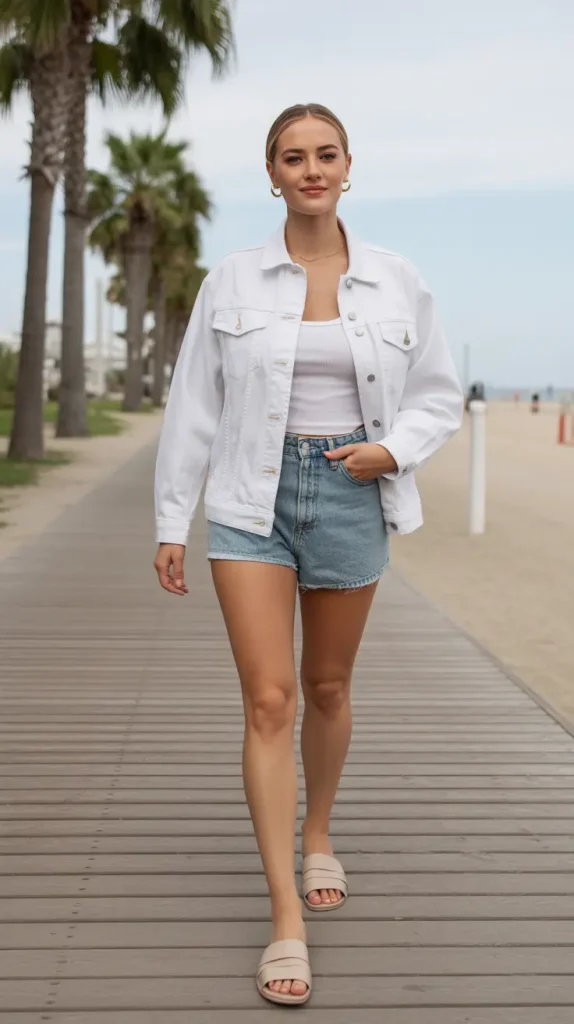 White denim jackets aren’t just for cooler days wear one with high-waisted denim shorts, a tucked-in tank, and slides for a breezy, weekend-ready look.