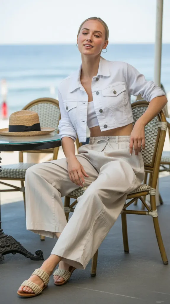 A cropped white denim jacket over airy linen trousers and woven sandals makes for a breezy, laid-back style. Perfect for beachside lunches or summer travel.