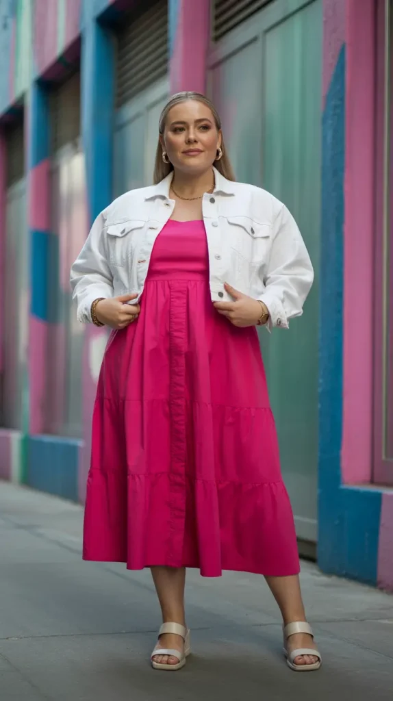 Layer a white denim jacket over a vivid fuchsia midi dress for a bold, cheerful pop of color. This look chic combination works beautifully for spring parties or dinner dates.
