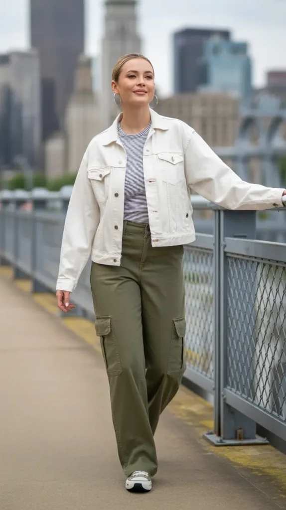 For a casual utility twist, wear a white denim jacket with olive green cargo pants and a striped tee. This street style option is comfortable, practical, and easy to make your own.