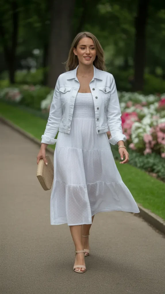 Nothing feels fresher than a white dress with denim jacket combination. This pairing works beautifully for garden parties, weekend brunches, or any time you want to look chic with minimal effort.