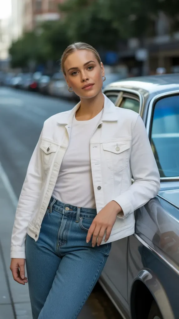 A white denim jacket with classic blue jeans and a clean white tee is as timeless as it gets. It’s a casual denim-on-denim style you can wear year-round, from summer strolls to cozy autumn afternoons.