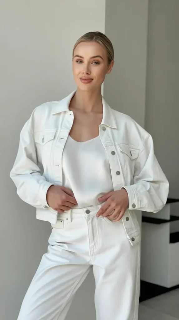6. Monochromatic White Denim Jacket Look