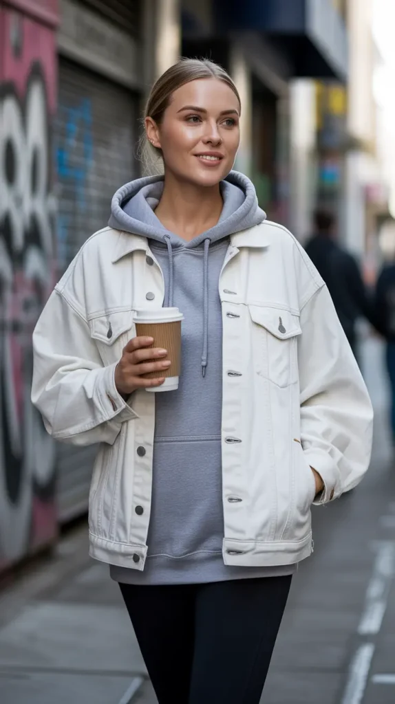For cooler days, layer a slightly oversized white denim jacket over a grey hoodie with black leggings. This light jean jacket outfit option is perfect for airport travel, casual coffee runs, or cozy weekends.