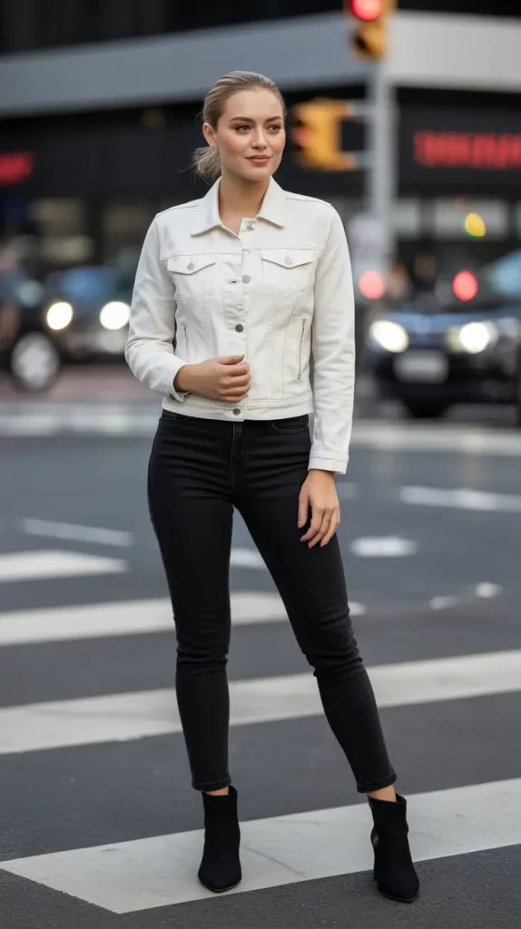 A fitted white denim jacket paired with black skinny jeans and ankle boots creates a sharp contrast that always looks chic. Ideal for casual evenings or smart-casual meetups.