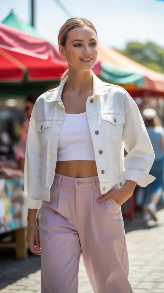 Combine a white denim jacket with pastel wide-leg trousers and a cropped tank for a look that’s fresh and playful. This outfit is perfect for spring afternoons or summer outings.