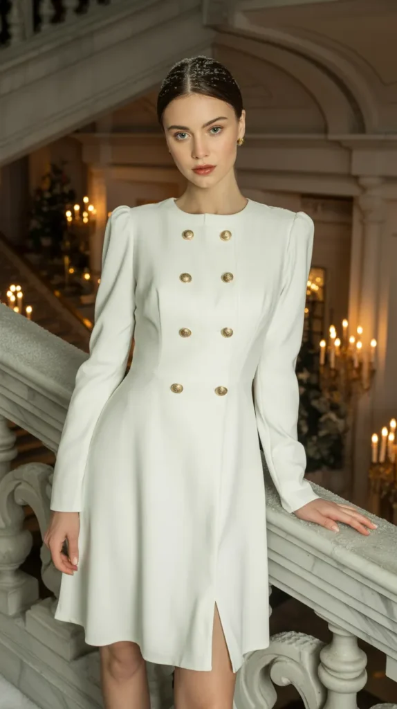 Minimalist design meets elegant detailing in this white winter dress choice. The gold buttons add just enough luxury to keep things interesting. It’s a timeless outfit that never goes out of style perfect for formal or semi-casual settings.