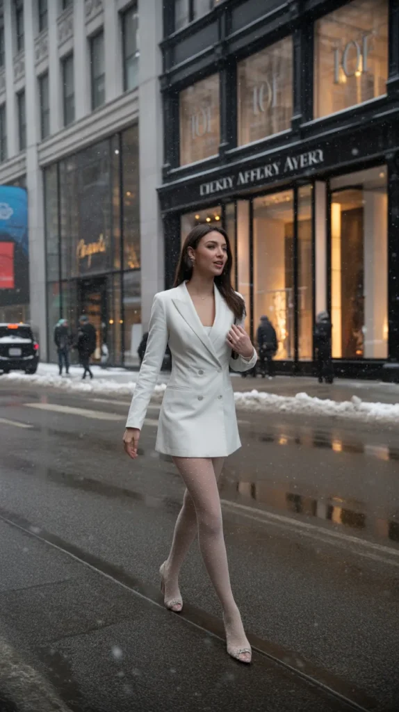 Powerful yet refined, this structured white winter dress gives businesswear a fashion-forward twist. Sheer tights and pointed-toe heels complete the ensemble with sleek sophistication. It’s the perfect look for women who want warmth and authority in one outfit.