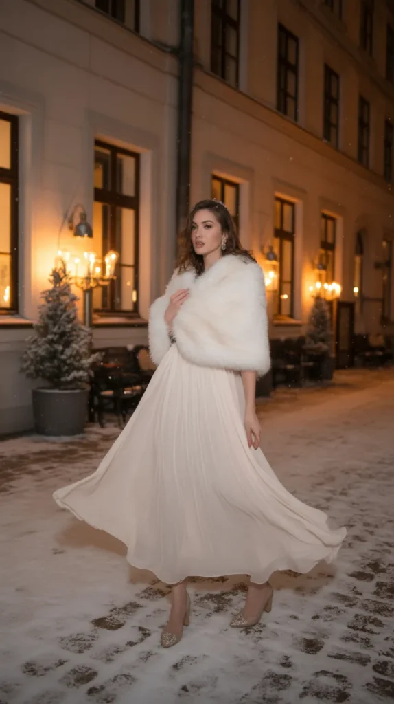 Ethereal and dreamy, this cold weather outfit captures romantic winter vibes beautifully. The chiffon moves gracefully with every step, while the faux fur adds cozy contrast. It’s made for winter parties, galas, or elegant evening gatherings.