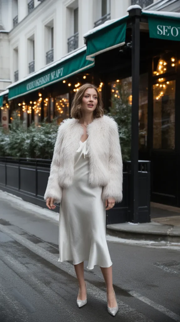 Nothing says luxury like satin paired with soft faux fur. This white dress winter look is ideal for evening dinners, holiday parties, or any event where you want to glow. The contrast between shine and texture makes the outfit feel expensive yet approachable.