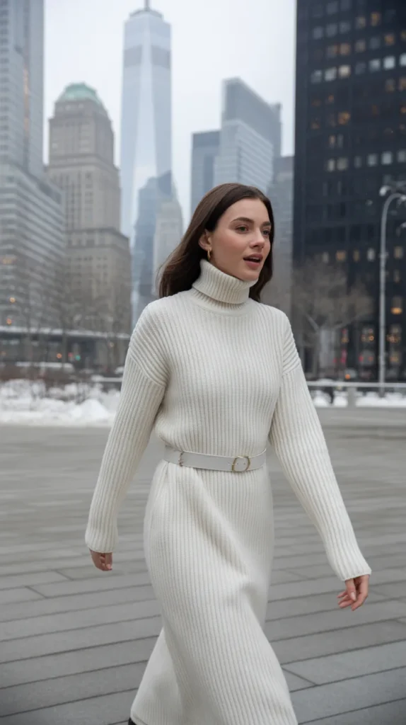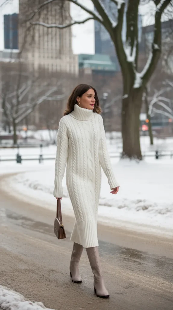 A cozy white winter dress that proves comfort and style can coexist. The thick knit fabric keeps you warm on frosty days, while knee-high boots add structure and polish. Perfect for weekend strolls or casual brunches that still call for effortless chic.