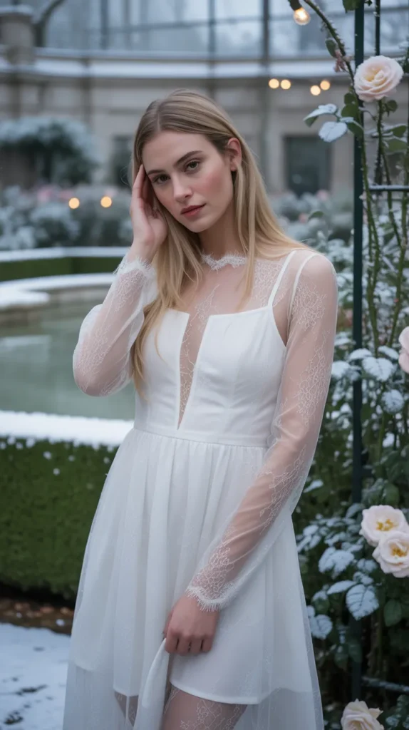 🧣 Play with textures: Pair your white winter dress with cozy knits, velvet coats, or structured wool to add depth and contrast.
